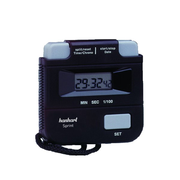 This model has a robust, water protected ABS case and it comes with a protective pouch and cord. The LCD screen displays 6 digits of size 5 mm. The following functions are included: start:stop:rest, addition:split/dual measurement, time of day, date.
