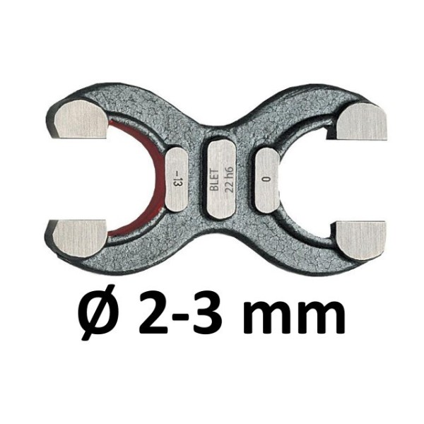 Double-end limit snap gauge with a diameter between 2 mm stricly and 3 mm. This snap gauge has go and no-go ends made of hardened gauge steel. It can also be hard-chrome plated or made of carbide.