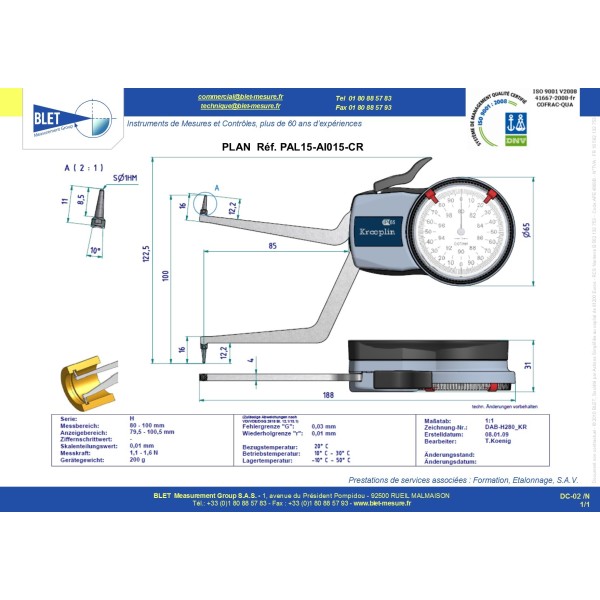 The internal gauge KROEPLIN allows the measure by mechanical or electronic display of diameters or internal dimensions, with a range of measure going from 2,5 to 400 mm,thanks to fixed or mobile touches and different depths of arm