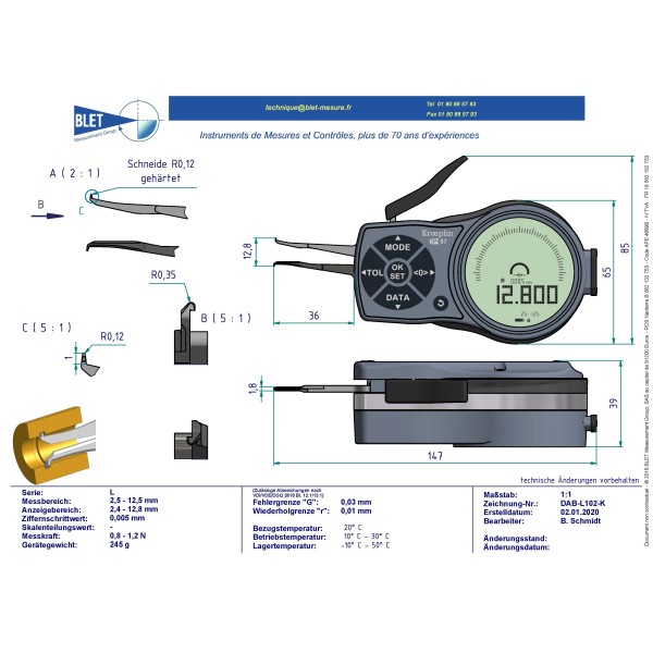 The internal gauge KROEPLIN allows the measure by mechanical or electronic display of diameters or internal dimensions, with a range of measure going from 2,5 to 400 mm, thanks to fixed or mobile touches and different depths of arm.