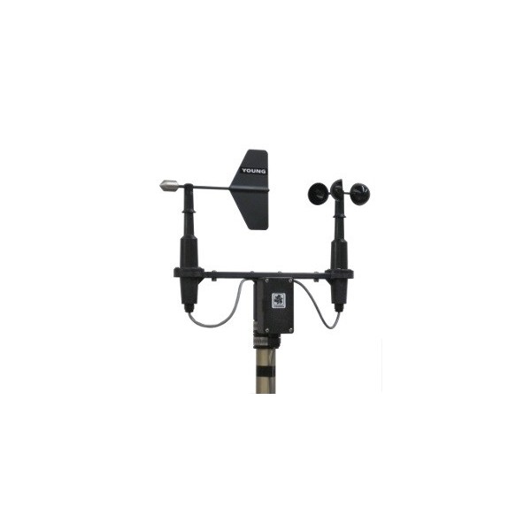 Wind sentry (speed and direction sensors), corrosion-resistant ; overall height 32cm, crossarm length 28cm, mounted on a 34mm diameter pipe. 3-Cup anemometer, 12cm diameter, AC output with 1 pulse per revolution (0-5V and 4-20mA output options). 22cm long turning radius vane with a 16cm turning radius, 1% linearity potentiometer with a life expectancy of 50 million revolutions. Operates at temperatures within the -50 to 50°C range.
