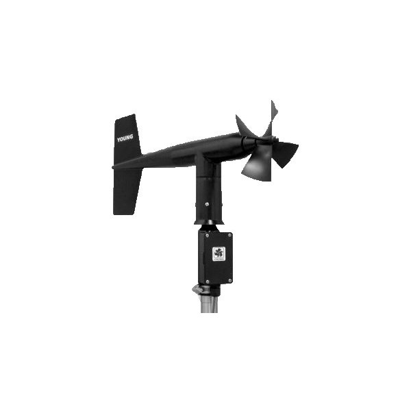 High performance wind sensor (speed and direction) with an ice-resistant coating ; height 40cm, length 57cm, mounted on a 34mm diameter pipe. Propeller anemometer with 4 helicoid blades molded of polypropylene, 14cm diameter, AC output with 3 pulses per revolution. 38cm turning radius vane, 0,25% linearity potentiometer with a life expectancy of 50 million revolutions. Operates at temperatures within the -50 to 50°C range.