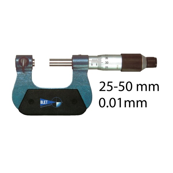 This micrometer is designed for the precise measure of external dimensions. It has a set of 7 interchangeable pairs of contact points. It is delivered in a case.