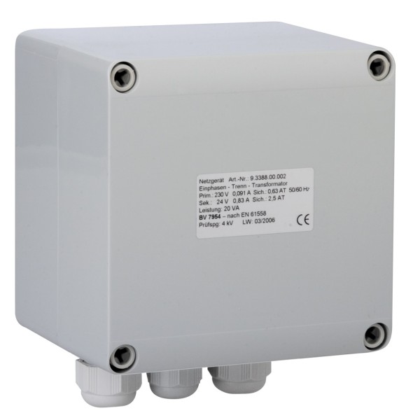 Primary voltage : 115 V / 60 Hz or 230 V / 50Hz Secondary voltage : 4x 24 V AC (2x 27,5 VA - 1x 100 VA - 1x 5 VA) ; 1x 24 V DC (2W)