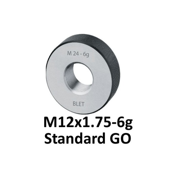 GO thread ring gauge with a diameter of 12 mm and a step of 1,75 mm. This gauge is made of a high-quality special gauge steel and is completely hardened, seaqsoned and finely polished. This gauge has a complete thread profile, effective and the core diameters corrspond to the largest dimension of the external thread to be tested. This gauge follows the standard(s): ISO; DIN 13.