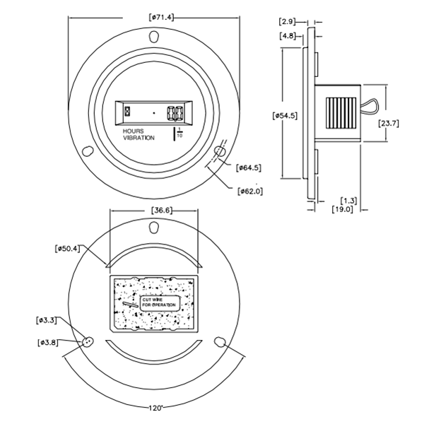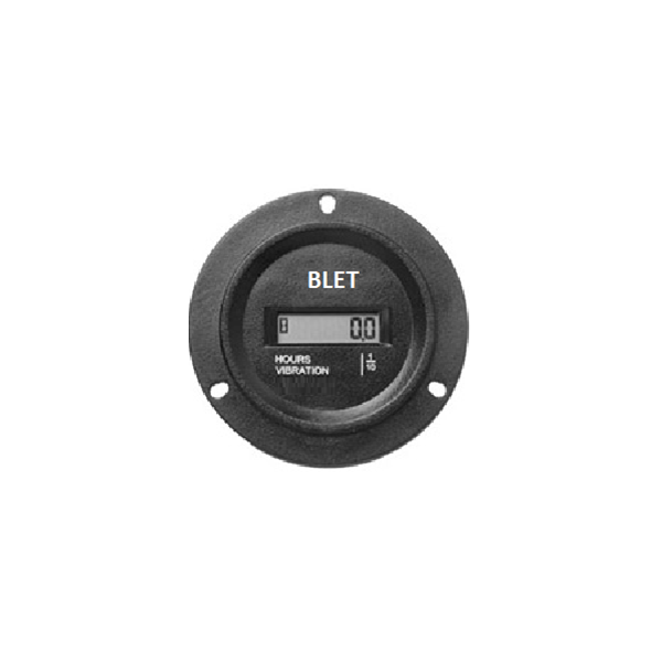 Digital vibration hour meter BLET. No external power source necessary. IP67. Battery not exchangeable. Lifetime 8 years. ROHS. Diameter 71,4mm.Data sheet