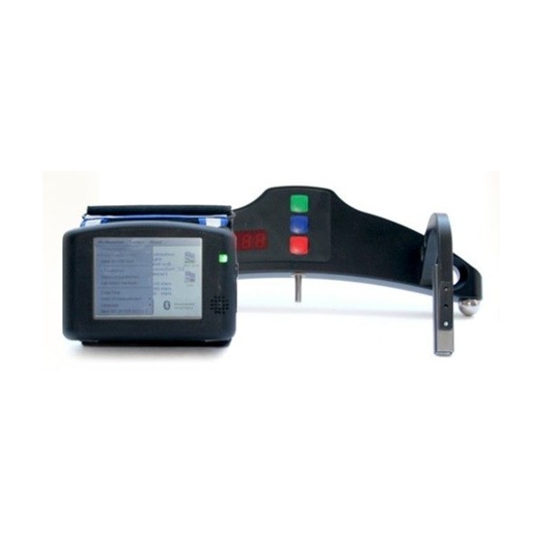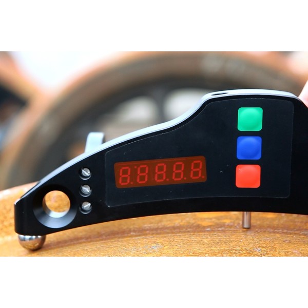 Train car wheel diameter measurement gauge, with a +/- 0.2mm measurement uncertainty and an accuracy to within 0.1mm, 0.01mm or 0.01in on a built-in LED display with a PDA, operating at temperatures between -5 and 55°C.