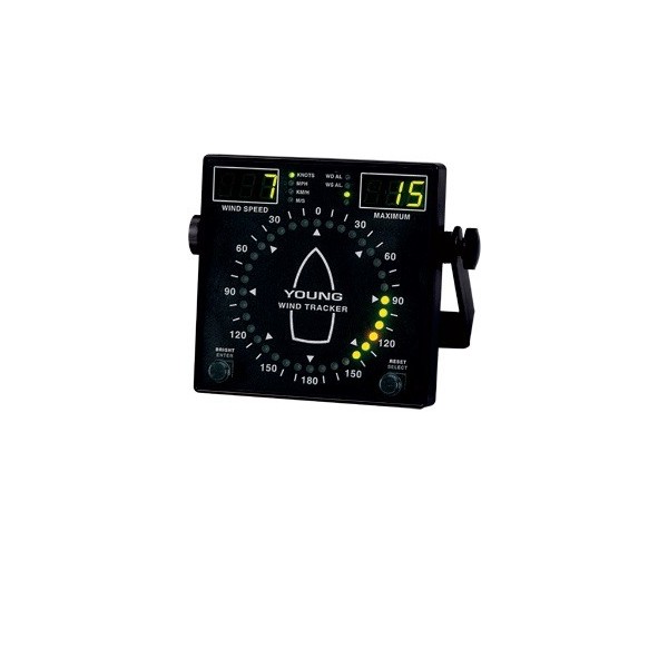 Compact high-performance display for wind characteristics (speed and direction) designed for shipboard use, with unit choice (knots, mph, km/h or m/s) and maximum wind speed display. Wind direction is clearly shown on a circular compass pattern of multicolor LEDs with brightness control for simplified reading. Great variety of analog (current and voltage) and serial (half-duplex RS485, 9600 baud, ASCII text format) inputs and outputs. Supports up to 16 remote displays, and includes alarms for both wind speed and direction.