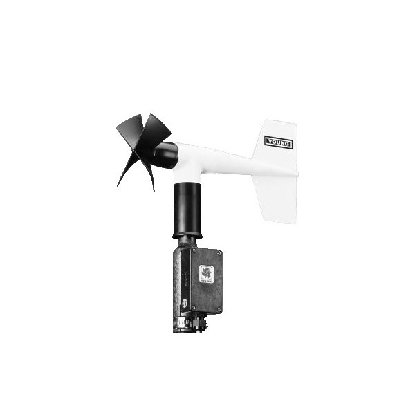 Capteur de vent (direction et vitesse) haute performance compact, résistant à la corrosion, hauteur 33cm, longueur 31cm, monté sur un tube de diamètre 34mm. Anémomètre avec hélice à 4 lames en polypropylene de diamètre 13cm, sortie AC avec 3 impulsions par tour (options de sortie 0-1V (alimentation 8-24VDC) et 4-20mA (alimentation 8-30VDC)). Girouette de rayon de rotation 21cm, potentiomètre de linéarité 1%, durée de vie 50 millions de tours. Fonctionne à des températures comprises entre -50 et 50°C.