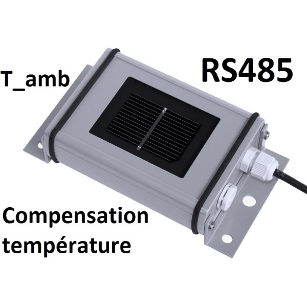 Irradiance sensor with a 155 mm x 85mm x 39mm aluminium case and a 50mm x 33mm monocrystalline silicon solar cell, operating at temperatures between -35°C and 80°C, with temperature compensation and a fixed connected ambient temperature sensor (-40°C to 90°C)