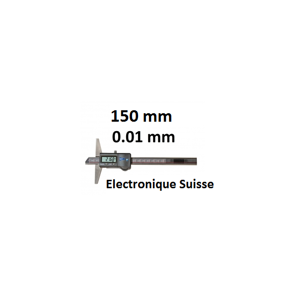 The digital depth caliper from SWITZERLAND is made of stainless steel, scale and nonius satin chrome finished, scale and nonius satin chrome finished. It has an accuracy of 0.01 mm a range of measurement of 150 mm, shockproof.