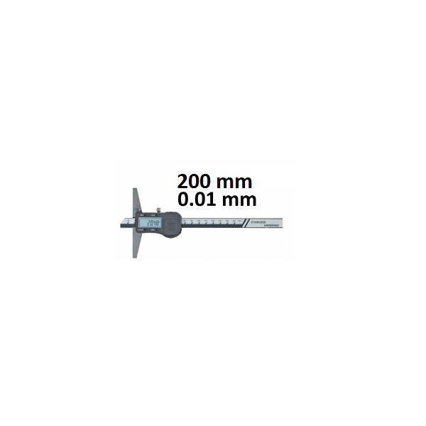 The digital depth caliper is made of stainless steel, scale and nonius satin chrome finished, scale and nonius satin chrome finished. It has an accuracy of 0.01 mm a range of measurement of 200 mm, shockproof.