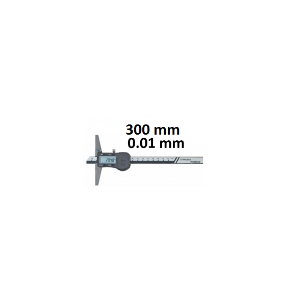The digital depth caliper is made of stainless steel, scale and nonius satin chrome finished, scale and nonius satin chrome finished. It has an accuracy of 0.01 mm a range of measurement of 300 mm , shockproof.
