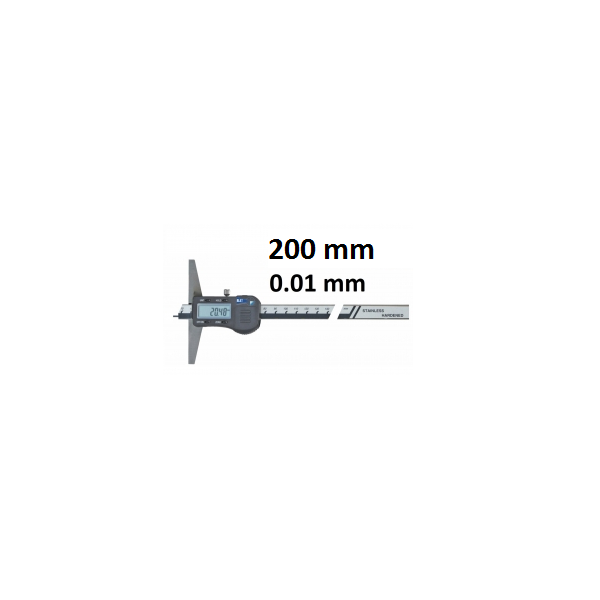 The digital depth caliper with needle point is made of stainless steel, scale and nonius satin chrome finished, scale and nonius satin chrome finished. It has an accuracy of 0.01 mm a range of measurement of 200 mm, shockproof.