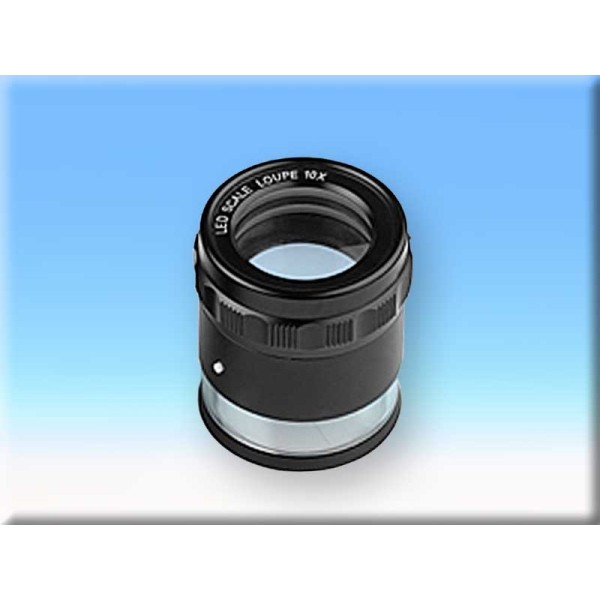 LED precision illuminated measuring magnifier with achromatic (chromatic aberration corrected) coated optic system consisting of 4 elements and 2 component assemblies. The measurement scale is made of glass and has a graduation 0.1 mm with a measuring length of 30 mm. The housing contains a ring consisting of 8 LEDs, which provides for a bright and high-contrast illumination of the measuring field.
