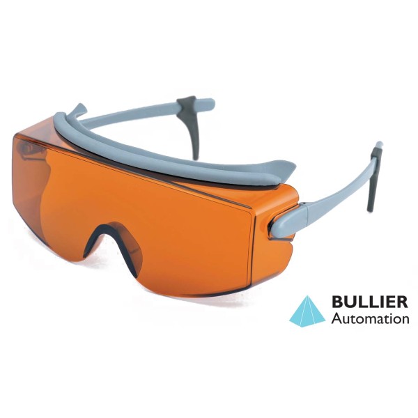 Sur-lunettes de protection laser avec monture nylon et elastomère et verre polycarbonate de dimensions 143x65x167 mm.