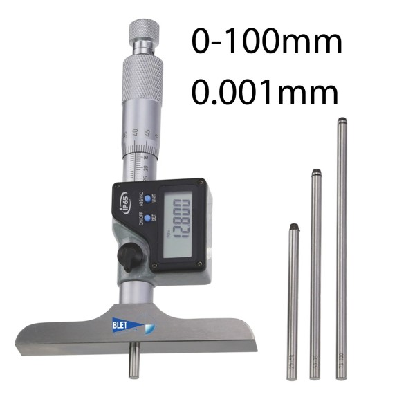This digital micrometer is designed to measure the depth of all sorts of holes. This article has 4 inserts with flat heads simply exchangeable for a broad range. Its base has dimensions of 100 x 16 mm. It is delivered in a case.