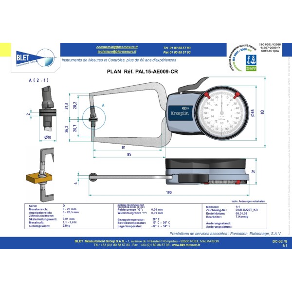 Les contrôleurs d?épaisseurs KROEPLIN (Pinces KROEPLIN) permettent la mesure analogique ou digitale de différentes plages de mesure allant de 0 à 200 mm de diverses surfaces et matières, grâce à une variété de formes et tailles de touches mobiles ou fixes telles que sphère, hémi-sphère, couteau,ou disque, et à des possibilités de grandes profondeurs de bras.