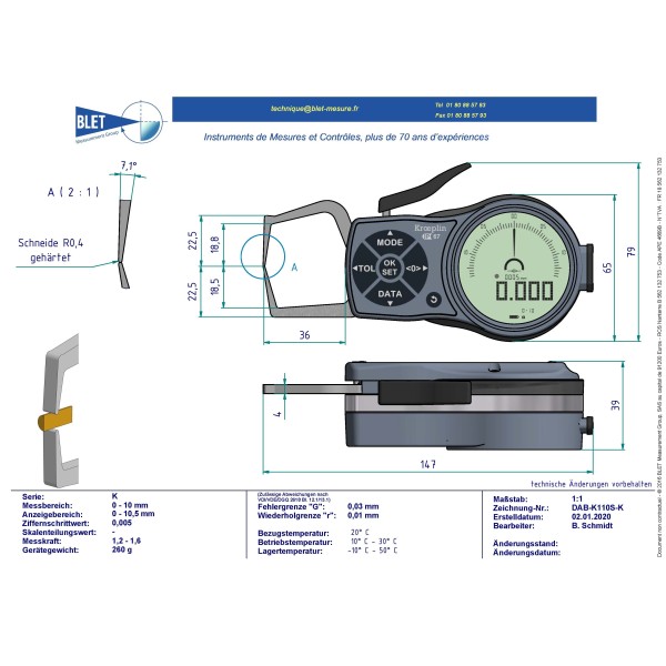Les contrôleurs d’épaisseurs KROEPLIN (Pinces KROEPLIN) permettent la mesure analogique ou digitale de différentes plages de mesure allant de 0 à 200 mm de diverses surfaces et matières, grâce à une variété de formes et tailles de touches mobiles ou fixes telles que sphère, hémi-sphère, couteau,ou disque, et à des possibilités de grandes profondeurs de bras.