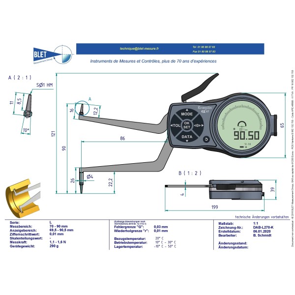 Les contrôleurs intérieurs KROEPLIN (pince de contrôle) permettent la mesure par affichage mécanique ou électronique de diamètres ou cotes internes variés, avec une plage de mesure allant de 2,5 à 400 mm, grâce à des touches fixes ou mobiles et différentes profondeurs de bras.