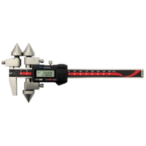 This BLET electronic caliper measures the distance between two centers of holes or a center and an edge. The reading is 0.01mm. It is delivered in its case.