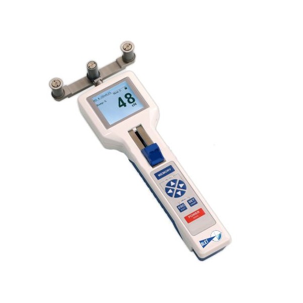 BLET tension meters allow accurating measures of wires, fibers, bands. Fields of application are large like textile, wire industries or optical fiber production. All our tension meters feature the 3-roller measuring system. The center measuring roller is deflected by the tension of the measured material. This measuring principle assures highest accuracy and repeatability. Ergonomic screen for easy reading. The scale mightbe adapted to other unit (as lbs). Other models on demand.